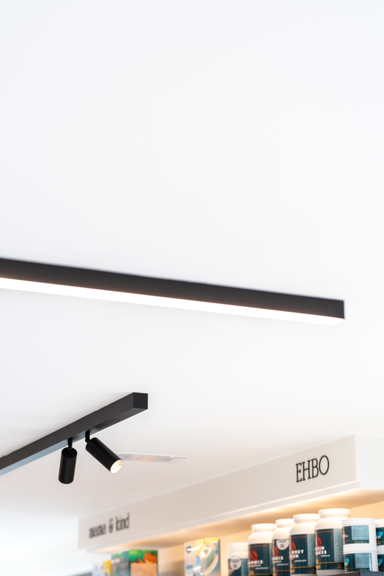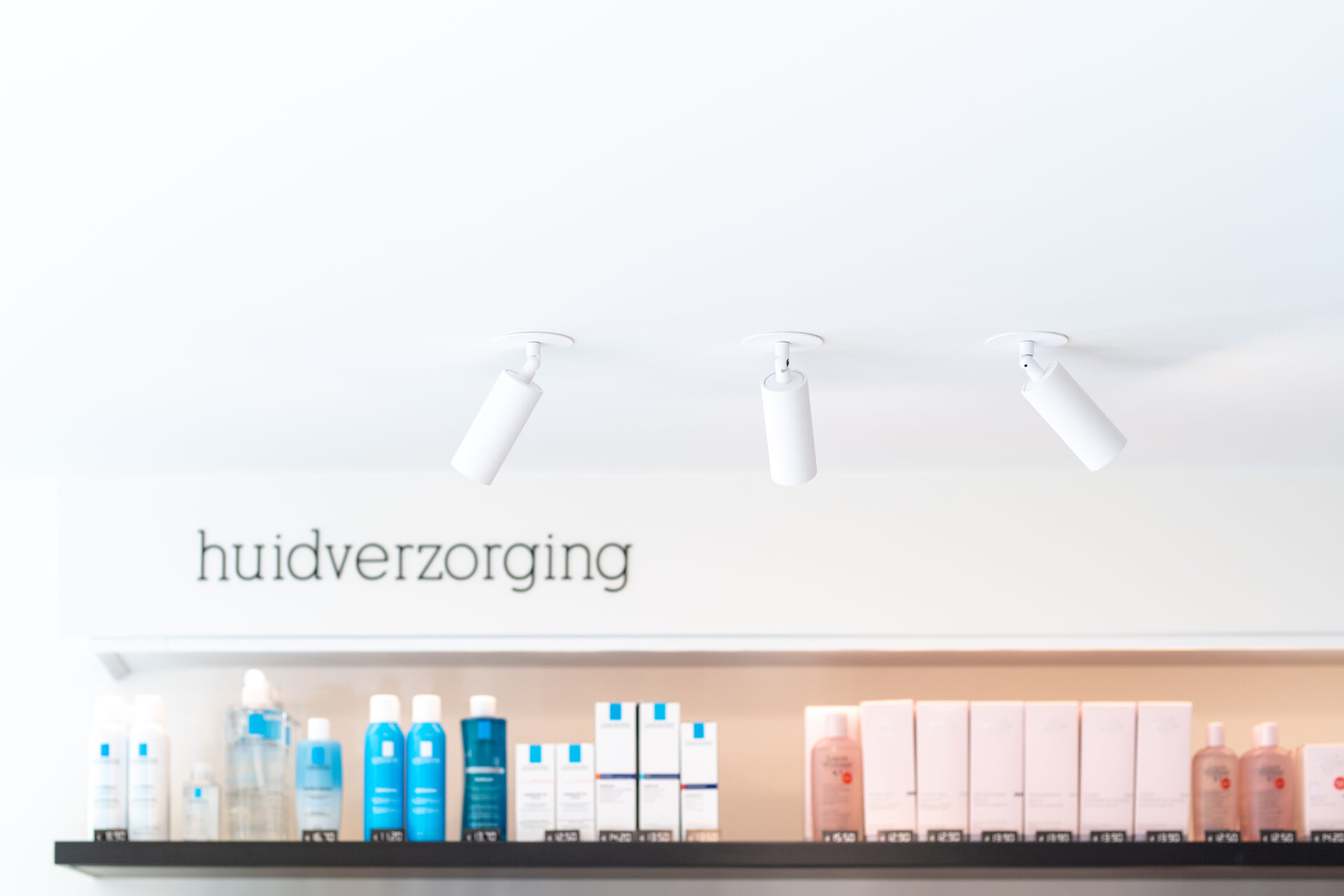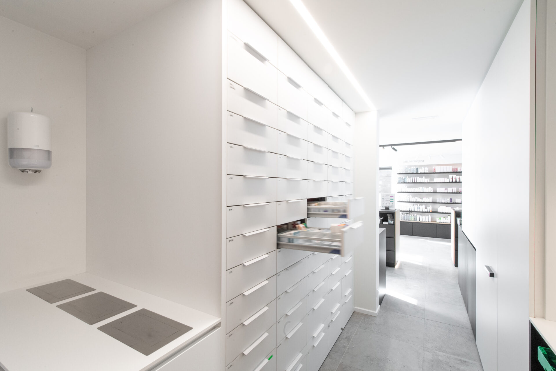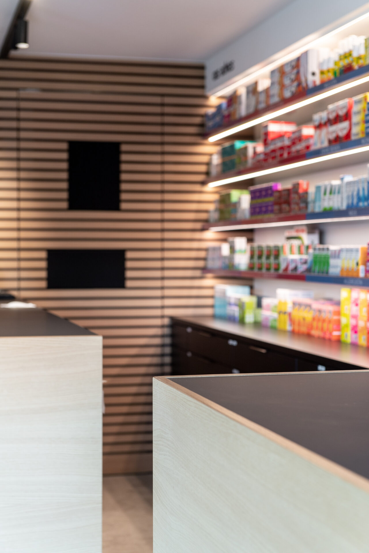 Minimalistisch maar toch gezellig. Dat was de vraag van apothekeres Marthe, die voor haar apotheek niet alleen een uitbreiding maar ook een nieuwe stijl voor ogen had. Voor de nieuwe indeling haalden we ruimte uit de garage en de bereidingsruimte. We creëerden een zwart-witverhaal met accenten in eik om het evenwicht te behouden tussen warm en strak. Functionaliteit en design gaan hand in hand: ledprofielen op maat zorgen voor de juiste uitlichting van de producten en de speelhoek krijgt een mooie plaats in het geheel. De zwart-witte gevel met zwarte belettering versterkt de minimalistische dan wel gezellige look and feel van de apotheek.