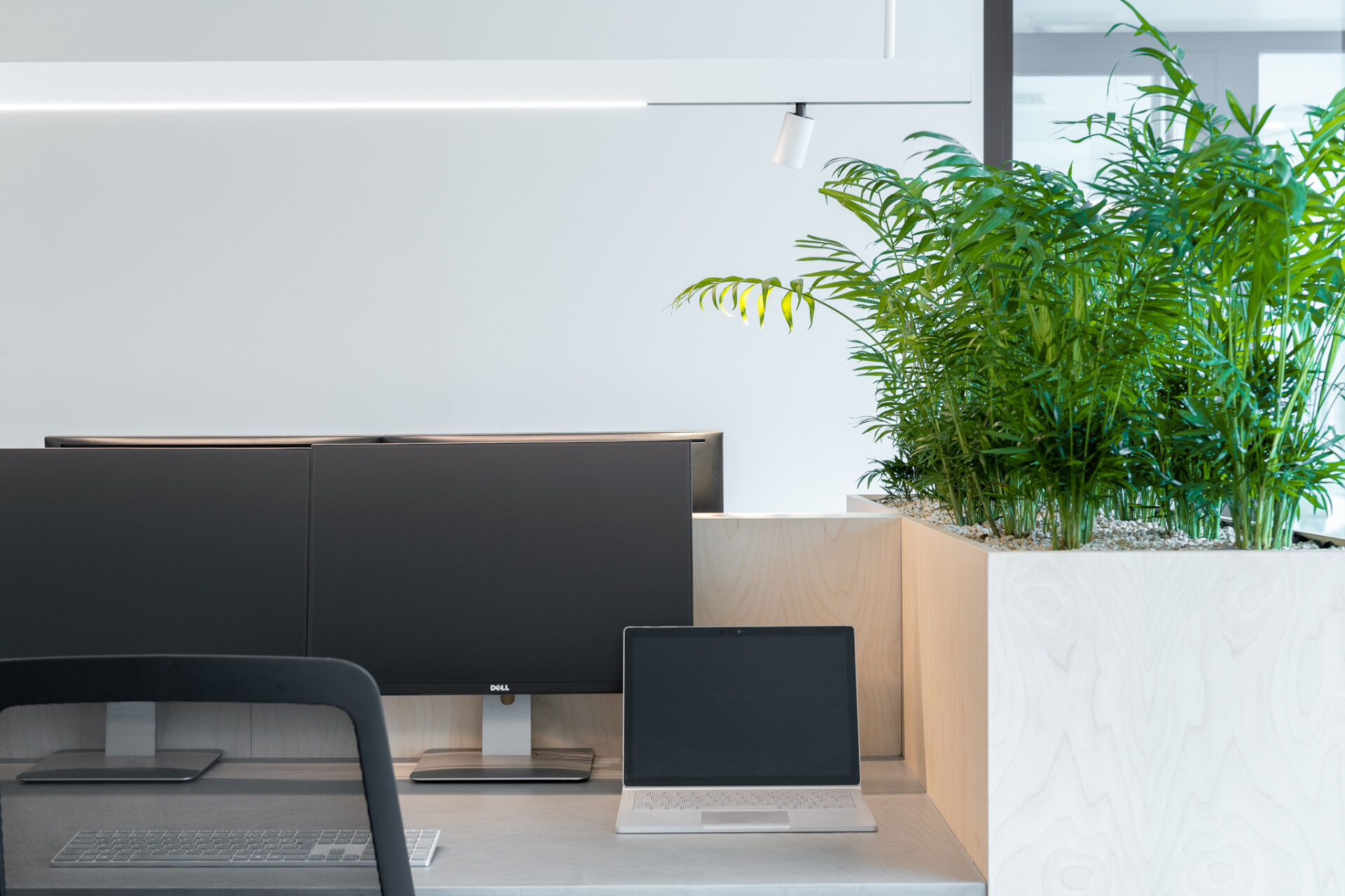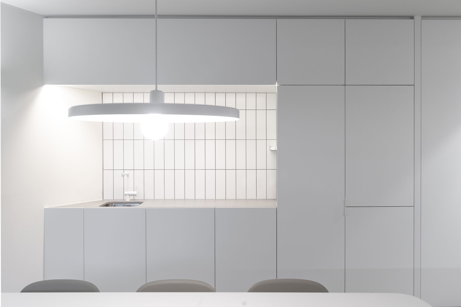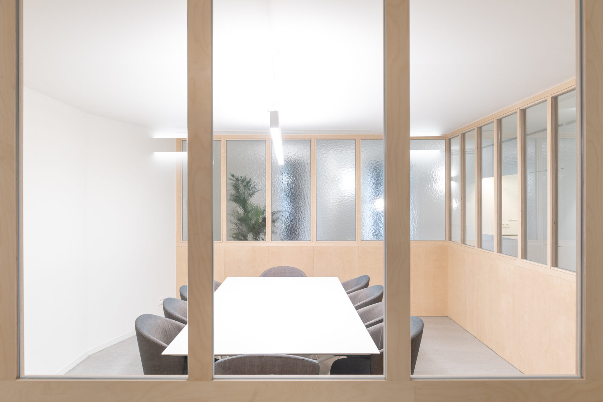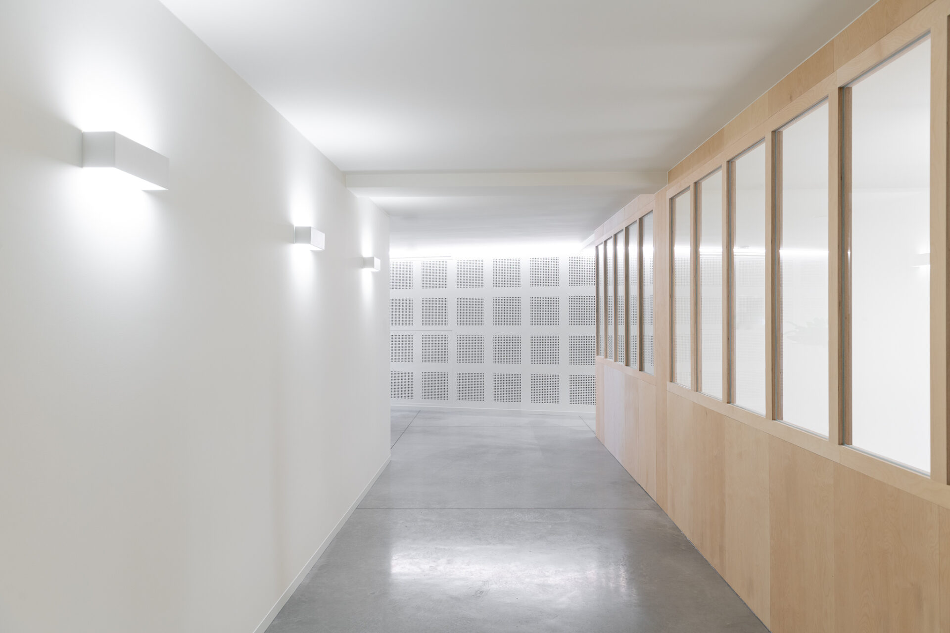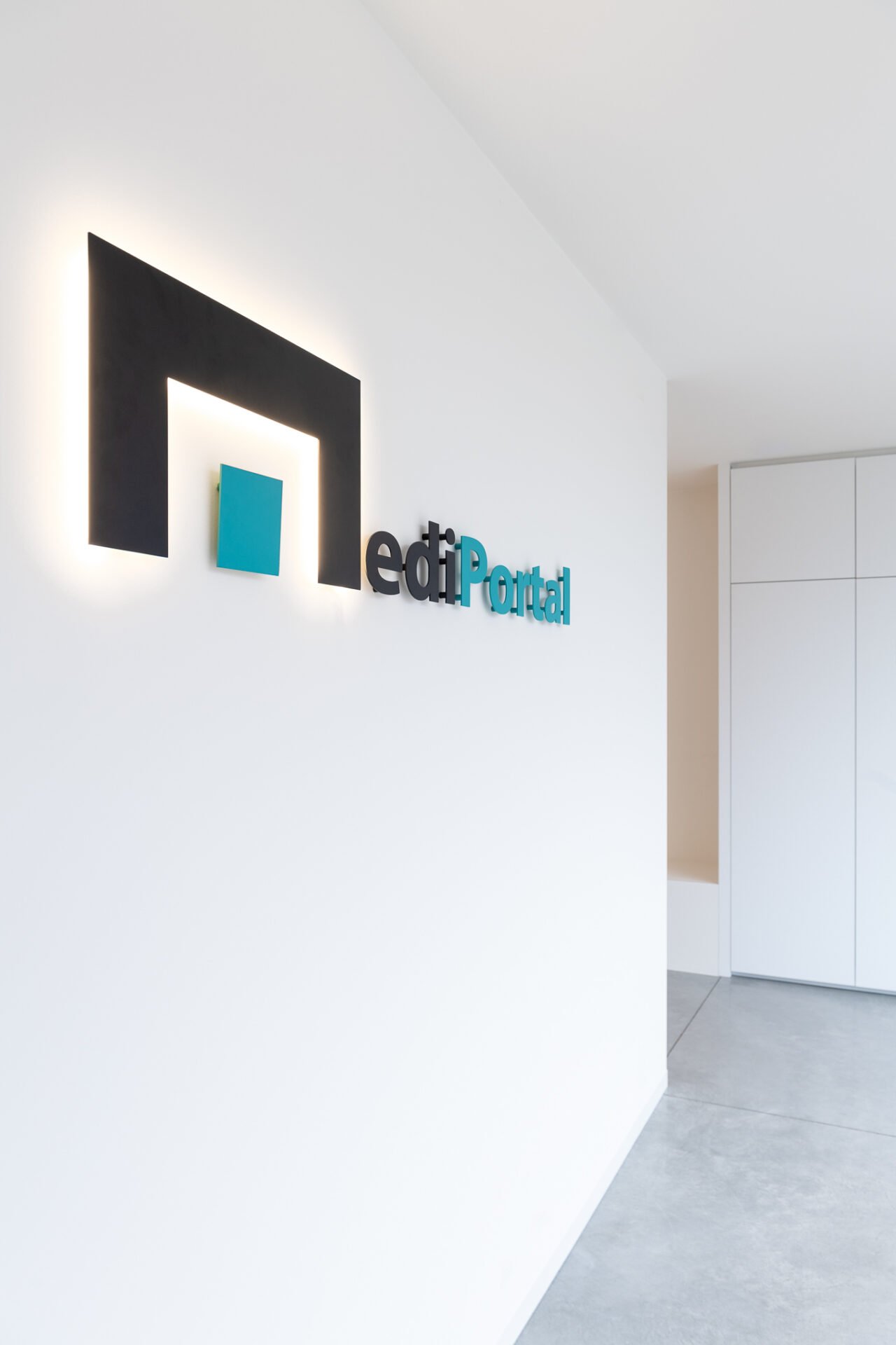 De tijd dat IT’ers in een dof kantoortje met TL-lampen achter hun vergeelde PC zaten, is gelukkig al lang voorbij. Tegenwoordig is een kantoorruimte doorgaans lichtrijk en fris, maar voor Mediportal mochten we nog een stapje verder gaan. De opdracht? Een lichte, ruime kantoorplek creëren die energie uitstraalt door het (beperkte) daglicht zoveel mogelijk naar binnen te halen. Toegegeven, aan de talrijke schuine lijnen en het middenblok met liftkoker en trappenhal hadden we een kluif, maar het resultaat is er: een lichtrijk kantoor waar de juiste energie door stroomt, omringd door een apart bureel, personeelsruimte, de befaamde 'chillzone' en vergaderruimte. Samen vormen ze een rustgevend geheel dankzij het doordacht gebruik van beton, berk, structuurglas, mortex en laminaat. Door bijkomende geluidsdempende materialen denken we ook aan het welzijn en comfort van de medewerkers. Esthetiek en functionaliteit in één.